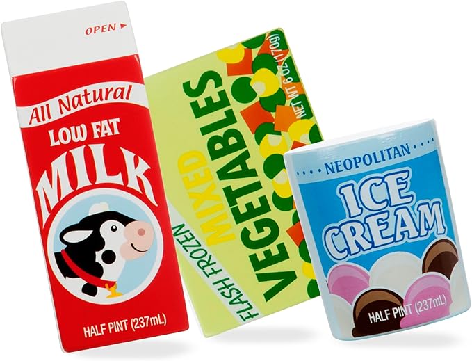 - 9 Realistic Toy Kitchen Accessories: Fill play fridge & freezer with wooden food packages like milk, cheese, waffles, & veggies, to create pretend shopping, cooking, & serving play with premium-quality wooden toys