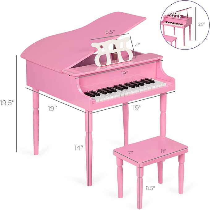 Best Choice Products Kids Classic Wooden 30-Key Mini Grand Piano Musical Instrument Toy w/ Piano Lid, Bench, Foldable Music Rack, Song Book, Note Stickers, Enamel Finish - Pink