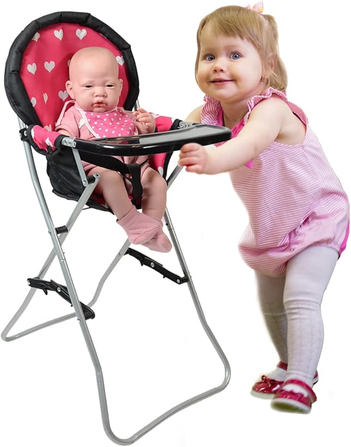 - FLORAL, LIGHT DENIM OR PINK HEARTS: Our high chairs for dolls are available in your choice of color combo. We carry the folding baby doll highchair in a beautiful floral print with coral trim or light blue denim with cherry red accents or pink fabric with white hearts. all are equipped with a plastic tray, snap buttons & plush padding to make the seat a comfortable place for dolls to sit.