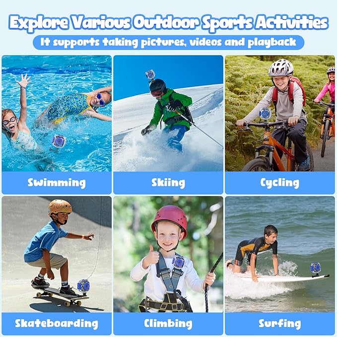- Up to 100ft Kids Waterproof Camera: Underwater camera for kids comes with a strong waterproof case that protects to depths of 100ft, great pool toys for kids ages 4-8. Prograce children camera encourages kids to play outdoor sports like swimming or biking