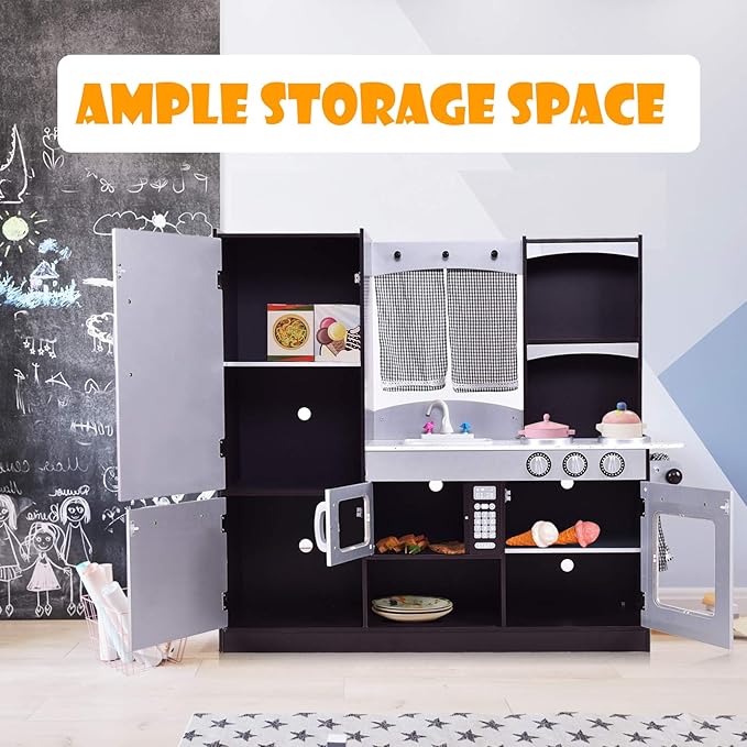 - Ample Storage Space: The storage space with doors of this toddler kitchen next to the sink and stove that can hold a large amount of “food”. There is also space under the microwave oven for storing extra “food” or kitchen utensils. The abundant storage space of the play kitchen sets helps children develop their sorting and organizing skills, allowing them to keep their toy kitchen tidy and orderly while playing, avoiding clutter.