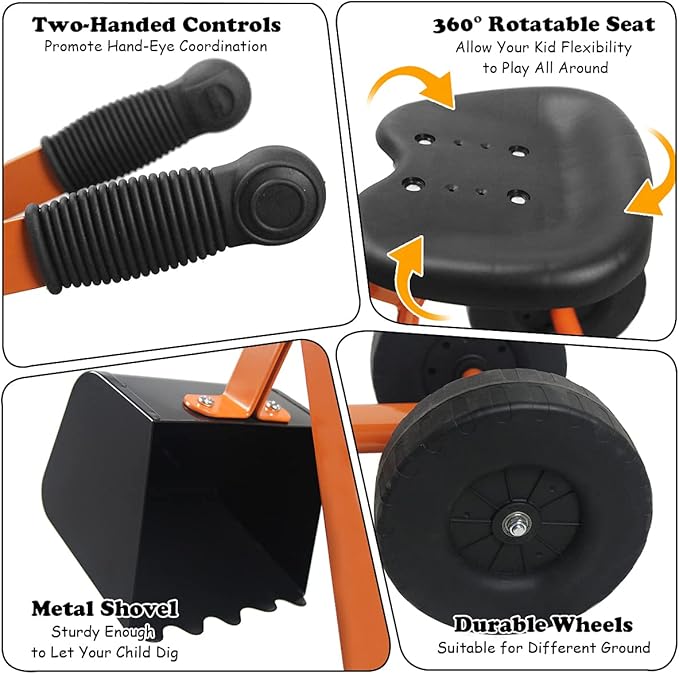 - [ 360° Rotatable Seat & 13” Large Wheels ]: The design of full 360° rotation seat offers your kids more flexibility to play all around. The dig likes an excavator in all directions with the moving arms and bucket to give more fun for your kids. Four casters are durable, allowing your children to play it on different grounds.