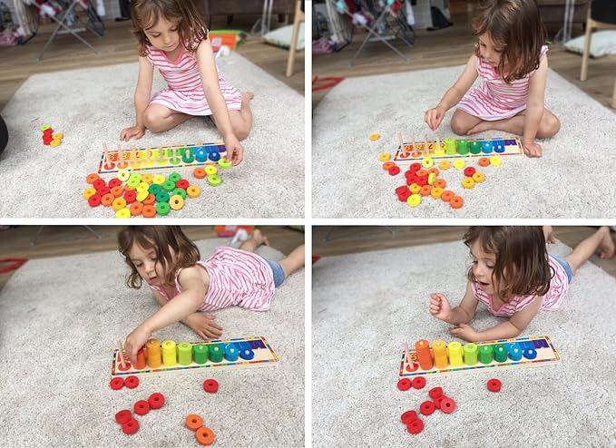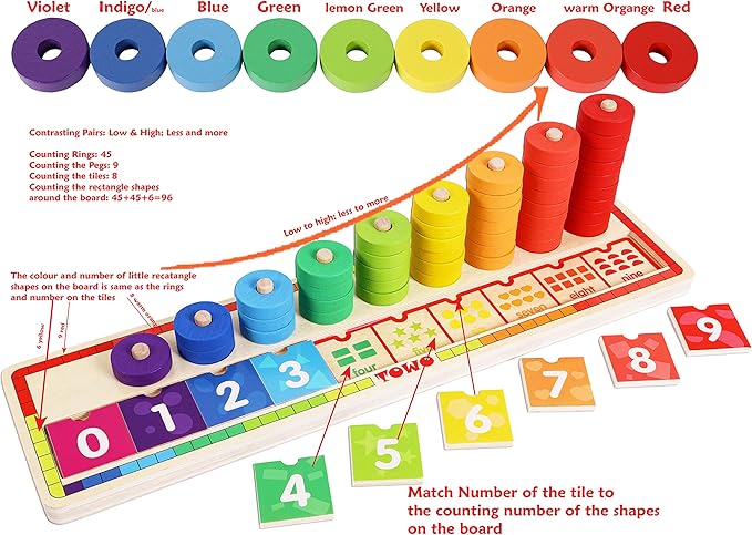 - It is one of the best stacking toys to learn numbers, counting, colour and number sorting and matching, doing simple maths, learning opposite of low and high (pegs), less and more etc. "0" marked at no peg on the based is good way to introduce the concept of zero. It is always advisable that an adult supervises and enjoys the interaction of children with this wooden educational toy for more learning.