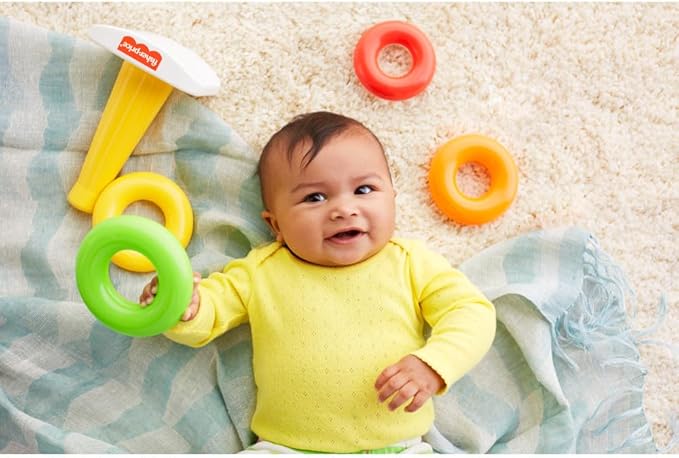 - Helps develop fine motor skills and gross motor skills as baby grasps, shakes, and stacks the rings