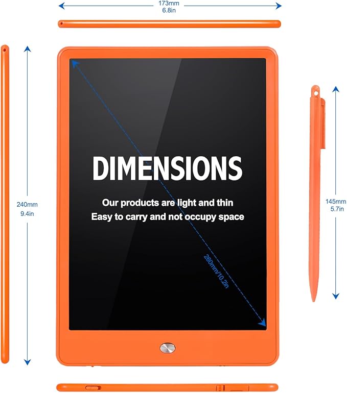 - Travel Essentials for Kids: Kids can spend happy time anytime and anywhere, enjoying the fun of drawing, counting, doodling, and spelling phrases. The 10 Inch LCD Writing Tablet is lightweight and ultra-thin, It is easy for you to carry and can be easily slid into your backpack and bags, not only play at home, but also in cars, outdoors, plane, and school