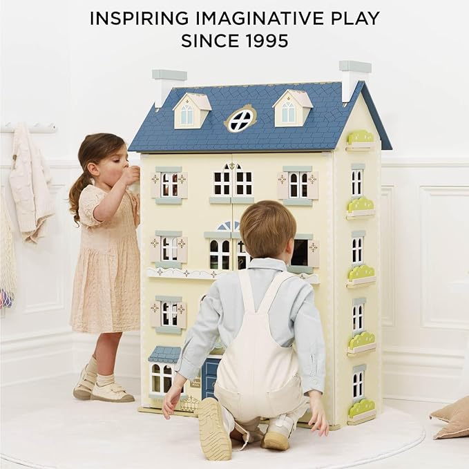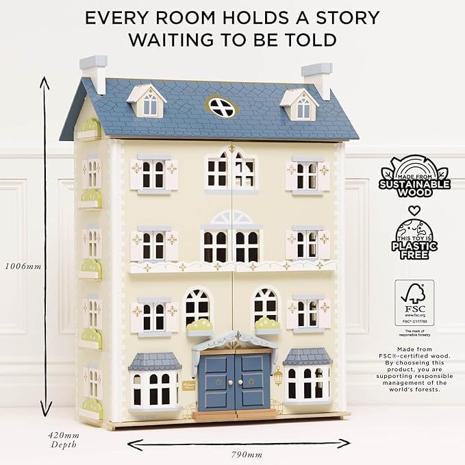 - HAND PAINTED, NOSTALGIC AND TIMELESS DREAM HOUSE DESIGN: A truly palatial doll's house, fit for royalty. The grandest house ever designed by Le Toy Van. With four floors plus an attic room, there's plenty of space for extensive play. An array of window styles and a regal double front door add to impressive appeal. Let you imagination run riot in this magnificent mansion. A touch of gold paint adds to the luxurious finish of this delightful doll's house.
