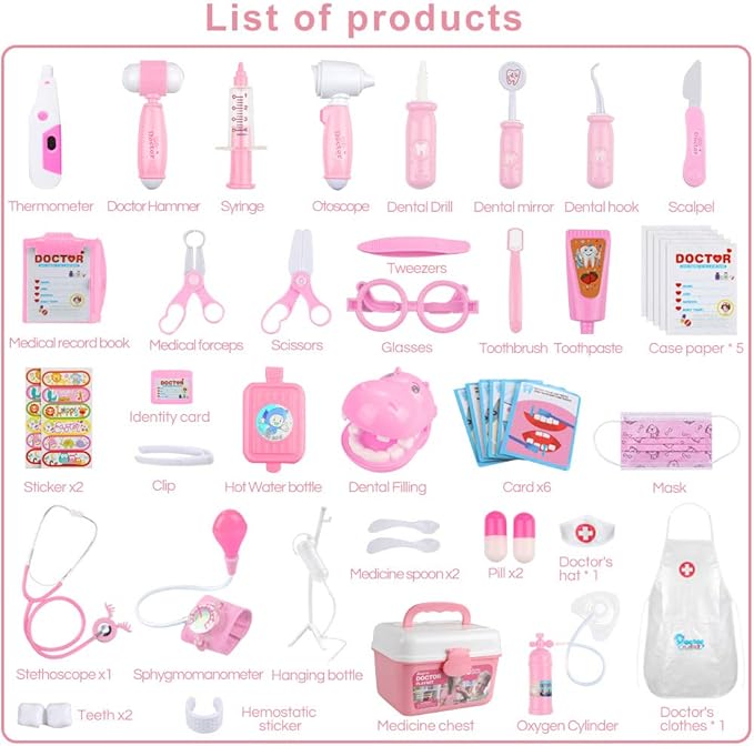 - Toy Doctor Kid for Role Play: The doctor set has an assortment of 46 medical tools & gadgets that will help children learn about the human body and calm doctor-related fears as they engage in doctor/patient role play with this kid doctor kit. Or pretending to play the dentist cleans his teeth and the children's medical kit teaches the child to familiarize himself with all the gadgets and equipment used by the doctor.46 piece medical tools & gadgets that will spark your child's imagination