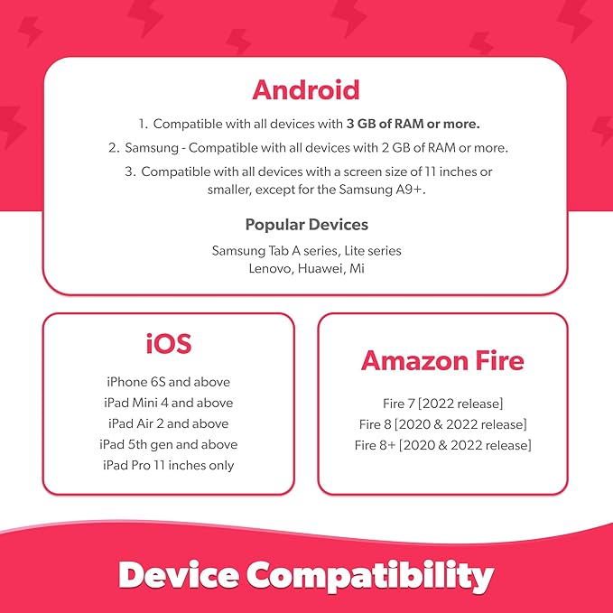 - Device Compatibility: Compatible with iOS devices (iPad 5th gen & newer, iPad Pro, iPad Air, iPad Mini 2nd gen & newer, iPhone 6 & newer), select Samsung tablets (2015 and newer with 2GB RAM), and Amazon Fire devices (Fire 7 9th gen 2019, Fire 8 8th gen 2018, 10th gen 2020). Some models are not supported.
