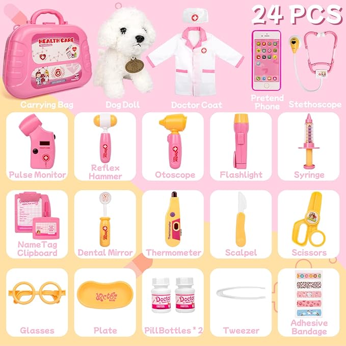 - Doctor Kit for Kids with Lots of Medical Tools & A Cute Dog Doll for Pretend Play. Meland Doctor Play Set comes with every imaginable tool that a future doctor will need, including a handy carrying case,stethoscope toy,syringe, thermometer, flashlight, pretend phone, dentist tools, doctor coat and hat, tweezers, scissors, eyeglasses and so on. This is such a wonderful starter surgeon kit for little kids who like to pretend play and help those who dreams of being a doctor.