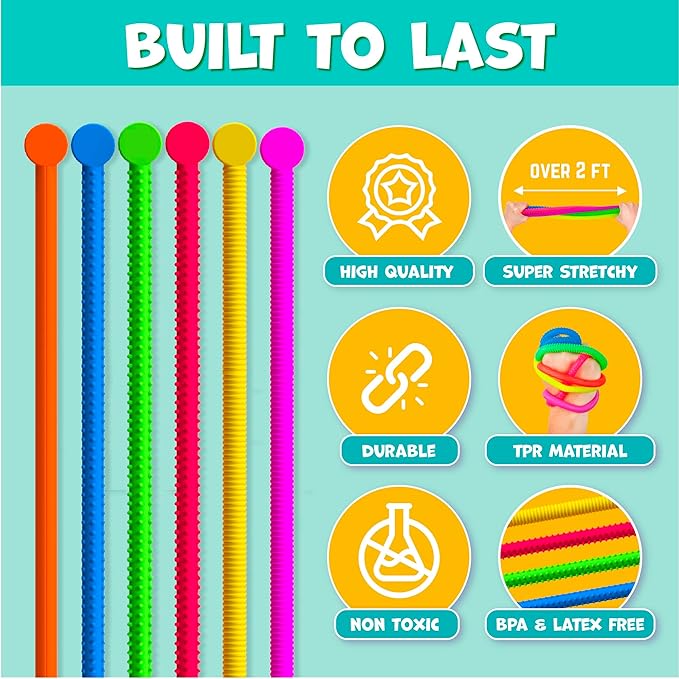 - Durable and Safe - Made from high-quality TPR, with BPA-free materials, these stretchy strings are soft, squishy, and easy to clean. They can stretch over 3 feet and are designed for extra durability.