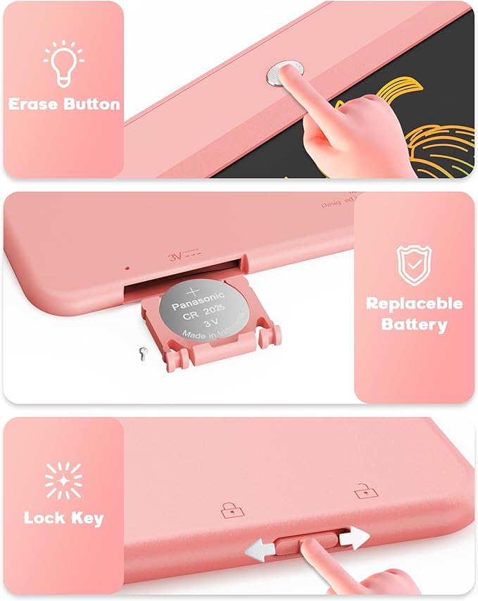 - EDUCATIONAL AND LEARNING TOY FOR KIDS: ♥ The battery door on the back of the drawing table is fixed by a screw, which is safer for children.LCD writing tablet for kids can be used as a doodle board, drawing tablet, writing board, doodle pad, kid’s drawing pad, toddler drawing board, graphic tablet, educational toys, toddler girl toys, baby girl gifts.