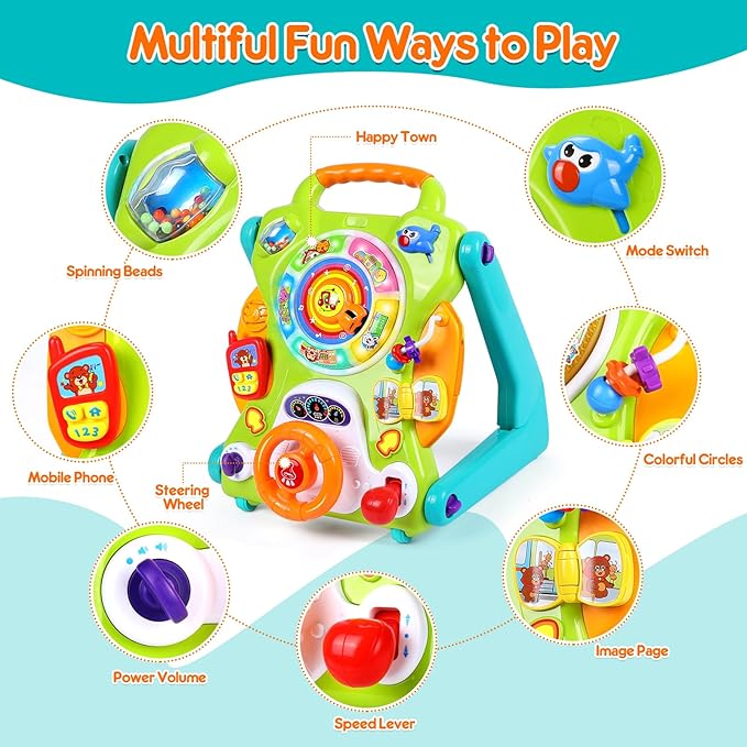 - INTERACTIVE ACTIVITY CENTER: Kids activity table with simulated driving, happy town, engine switch, lever, airplane, rotated rattle, mobile phone, colorful spinning beads, turning page. Sit to stand activity center plays various sound effects and LED flashing, enhance kids’ sensation. A-must-have for interact & connect through play.