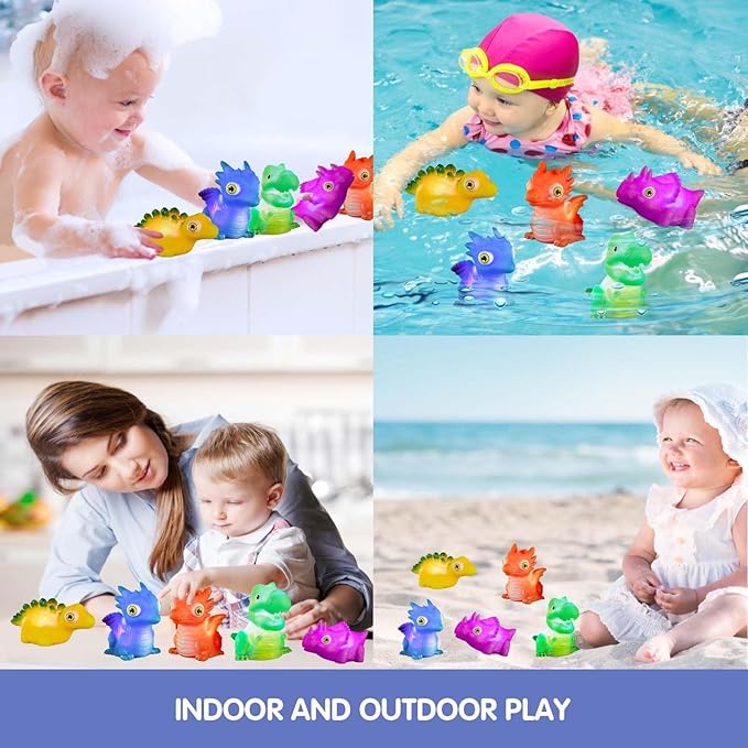 - Cute dinosaur bathroom toys have textured skin, bright color and big cute eyes, sealed well, good size to grab. Funny tub time.