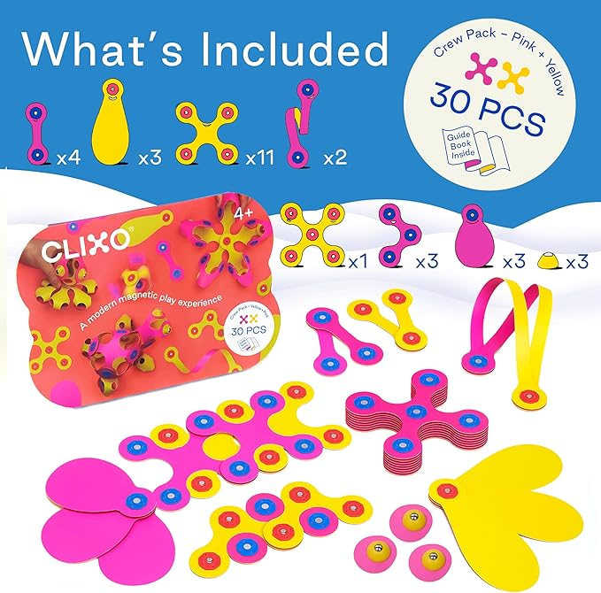 - BUILD MORE WITH LESS – The 30-piece pack offers unlimited possibilities! Clixo’s patented design allows kids to construct complex creations with fewer pieces, encouraging them to fold, flip, and connect for maximum creativity. A quick start guide helps build their first five exciting designs, while intuitive magnet feedback lets them know each piece is securely in place.