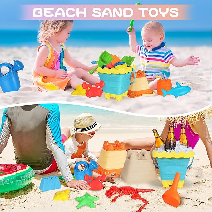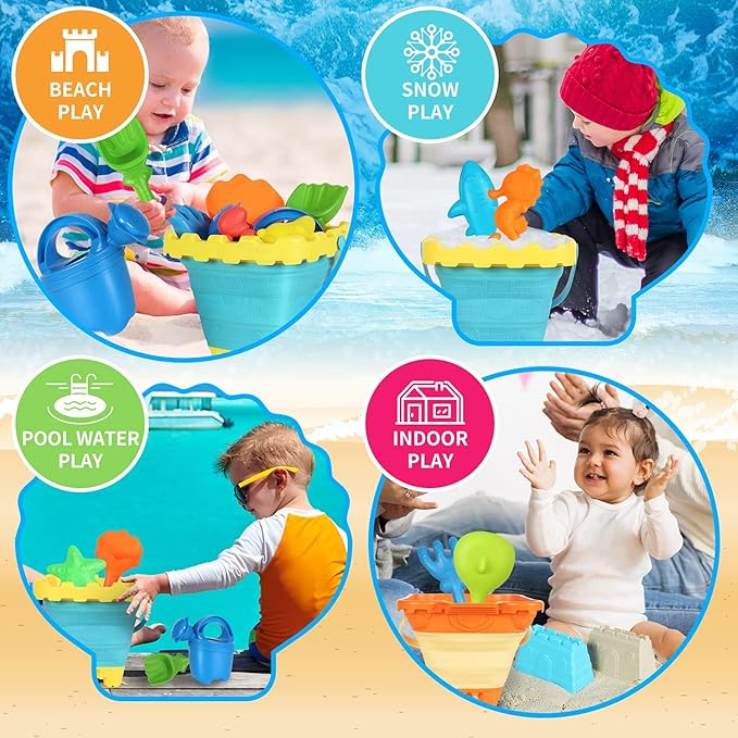- COLLAPSIBLE CASTLE STORAGE BUCKET: Our beach toys kit contains two folding silicone pails of different sizes, which can hold 2.7L and 1.6L sand or water. It can be opened and folded with just a light press, easy to store and carry. The cute castle-shape help kids to build sand castles while accommodating various items