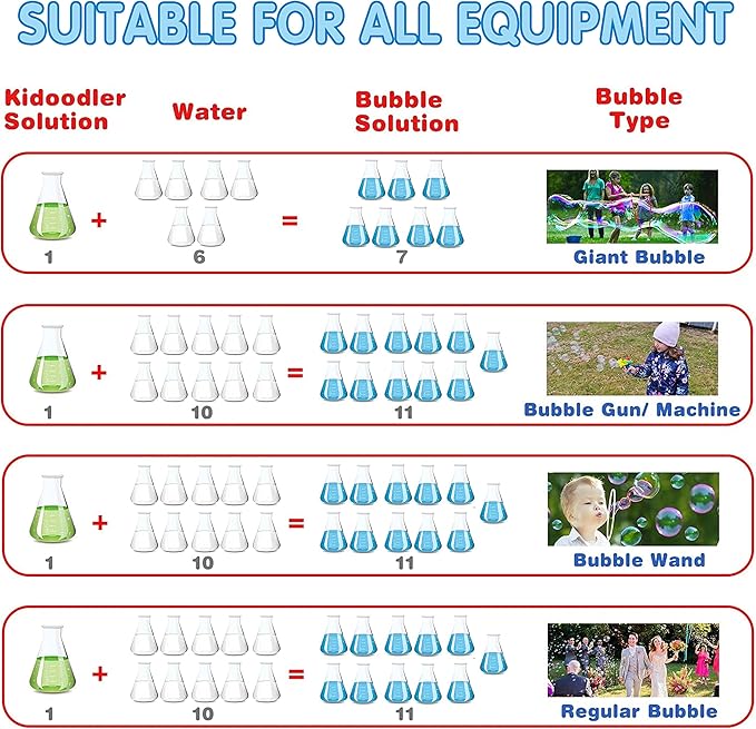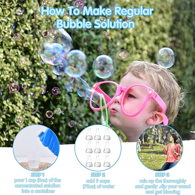 - SUPER VALUE. Bubble Solution Refill Weight: 64 OZ Includes 2 Bottle of 32 FL. OZ. of Premium Soap Concentrated Bubbles Solutions – JOYIN Toy Bubbles Fluid Solution Refill has been formulated to Create Both Regular and Giant Bubbles. Regular Bubble 1:10 Total Make 2.5 Gallons / Giant Bubble 1:6 Total Make 1.5 Gallons.