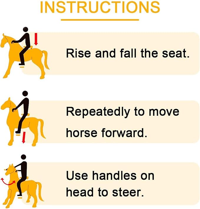 - ✔ SOFT AND PLUSH HORSE: A softly padded polyester plush body and comfortable riding saddle over a sturdy metal frame. The comfortable footrests are added for safety and easy operation. Just note: the wheels can't roll backward, forward only, enough to ensure safety.