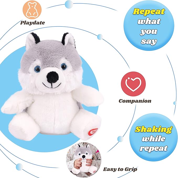 - A INTERESTING TOY FOR KIDS: Still buy some boring stuffed animals or dolls for your little one? Why not try this talking husky? It can talk back and repeat what you say which helps your kids to learn language in a funny way. This husky also is a loyal companion. It could accompany your kids all the time and make them happy by clearly repeat whatever they say in its amusing voice.