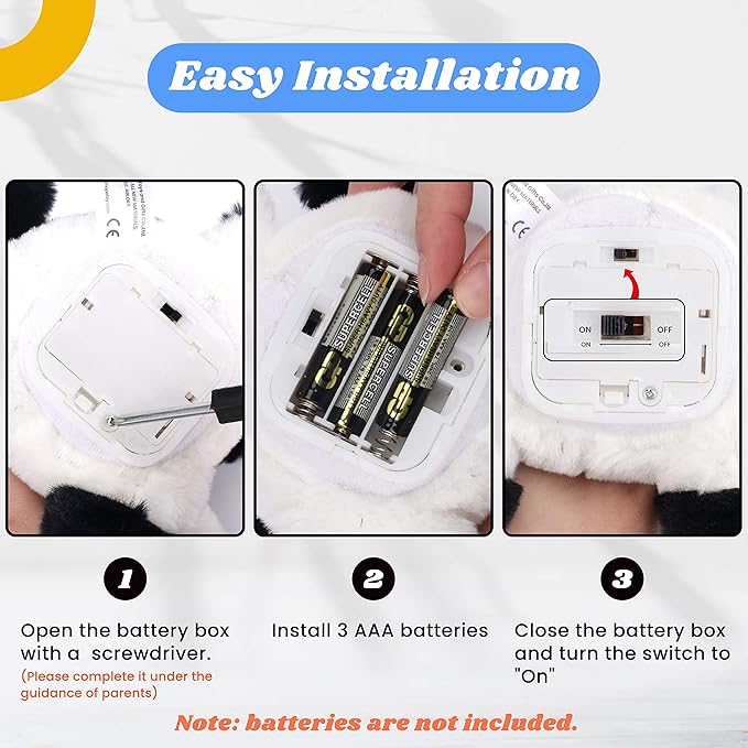 - CONSIDERATIONS: Adults should open the battery box with a screwdriver. Put in 3 AAA batteries (NOT INCLUDED), and turn the switch to “ON”. Just press the button to play with it. Please remove the batteries if for long time storage and keep it away from fire and water for safety reasons. Do not wash it. If you have any questions about the problem, please don’t hesitate to contact us. We’ll response in 24 hours.