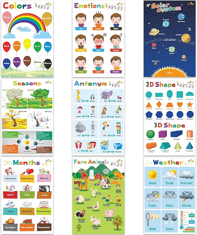 - 【18 Different Learning Posters】SK SUPKER 18 different preschool educational posters make a great educational resource for children, include alphabet, numbers 1-10, numbers 1-100, days of the week, months, seasons, time, weather, antonym, farm animals, shapes, addition, subtraction, emotions, my body and solar system. It's a necessary preschool homeschool curriculum kit for you and your baby.