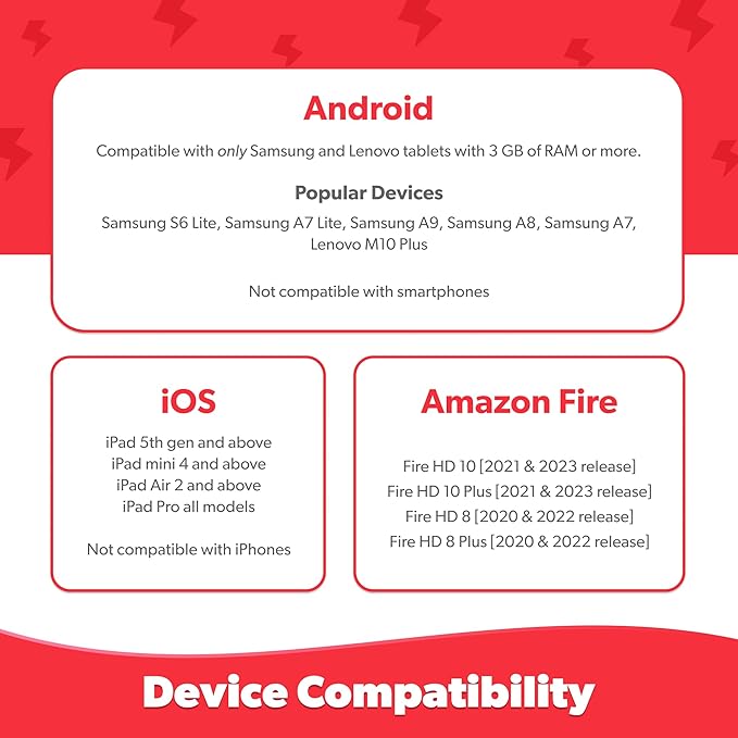 - DEVICE COMPATIBILITY: iOS - iPad 5th gen & above, iPad Air - all models, iPad Pro - all models, iPad Mini 2 & above | Android - Samsung & Amazon Fire Tablets as per specifications