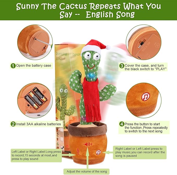 - ADJUSTABLE VOLUME CHRISTMAS CACTUS: Volume adjustment, repeating, recording, lighting, talking, swaying, imitating, singing and dancing) -christmas dancing cactus can repeat what you say, and baby cactus toy will light up and sing. If you have any questions about the product, please feel free to contact us.