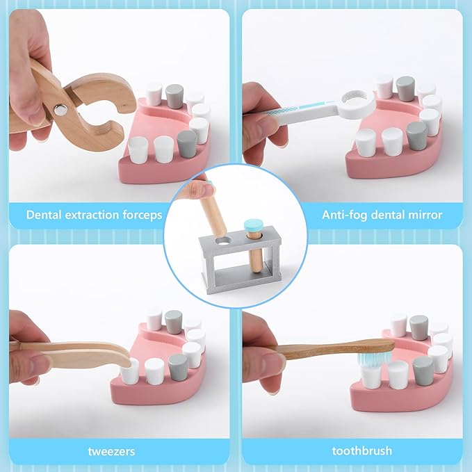 - 36 PIECE Realistic Doctor Kit : UMU wooden doctor playset dentist accessories include a medical box with Stethoscope, Ointment, Medicine Tank, Pills, Dental Mold, Pliers, Scorpion, Hammer, Toothbrush, Syringe, Blood Pressure Meter, CT Display, 4 Inspection Tool, Handbag and Dental Floss