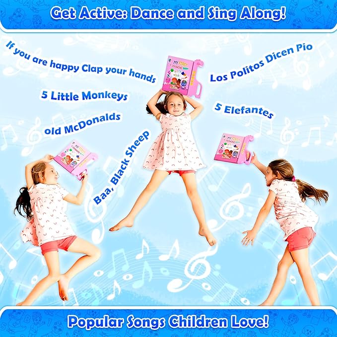 - 🔰 BEST GIFT AND TRAVEL BOOKS FOR 3+ Year olds Perfect for car rides, airplane travel, long trips 3AA Battery included, no Wifi required. Automatically shuts off to preserve battery life, when not in use. Wonderful music and pleasing sounds(4 in English 2 in Spanish) are easy to catch your child's attention, Best Gift Age3+