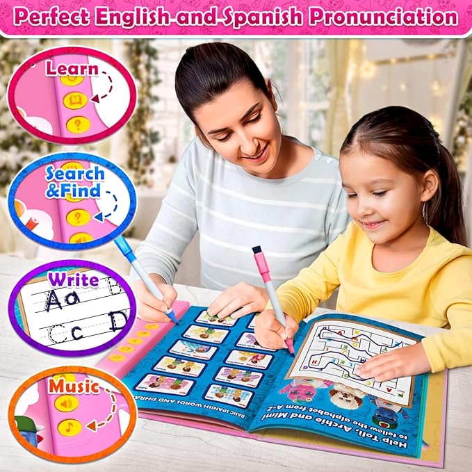 - 🇺🇸🇪🇸 BILINGUAL ENGLISH & SPANISH — GREAT FOR FAMILY LEARNING Perfect for bilingual families or parents introducing a second language during the holidays. Kids learn daily phrases, greetings, foods, animals, and more in English and Spanish. (Juguetes Educativos para Niños y Niñas) Ideal for holiday gifting, classrooms, homeschool, and family learning time.