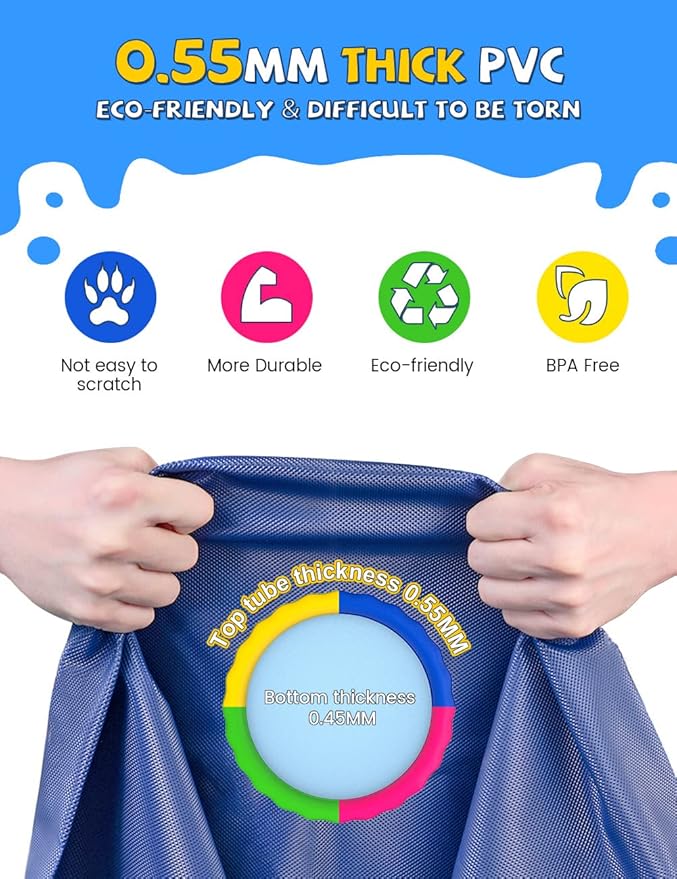 - MORE THICKNER MORE DURABLE: The dog splash pad is 0.55MM, which is thicker and more durable than other 0.25mm splash pads, so pets dog and children can play on it without worrying about being damaged by the paws of the pet. Tip: Pets need to trim their nails first when playing water mat.