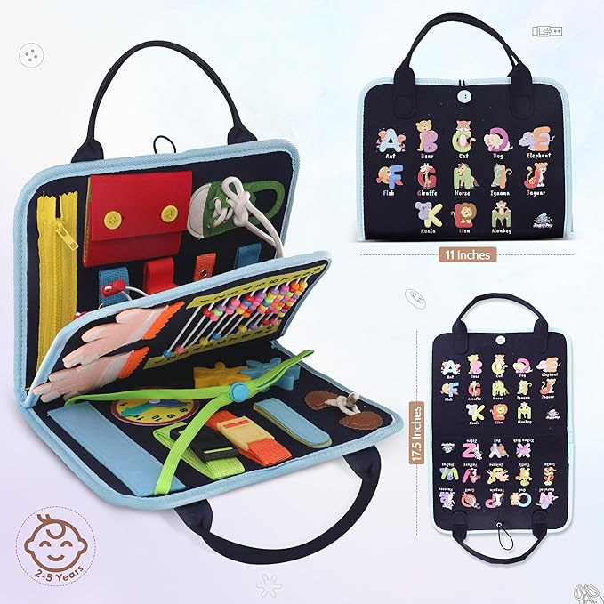 - 🎨 Engaging Montessori Learning Activities: Spark your toddler's curiosity with colorful, hands-on features like an abacus, felt fingers, weather wheel, zippers, buttons, and more. Designed to encourage real-life skills, improve fine motor development, and boost hand-eye coordination through fun, independent play.