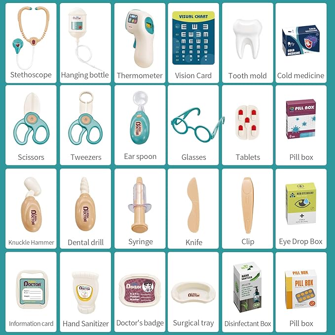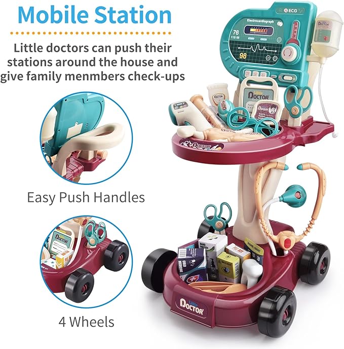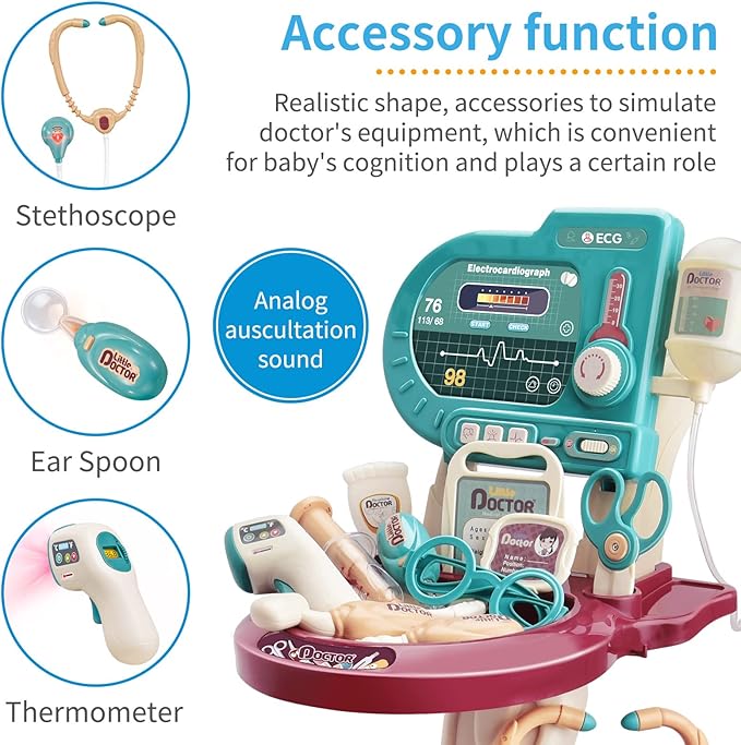 - A complete fun of medical tools: The doctor cart kit comes with a stethoscope, syringe, endoscope, thermometer, eye chart,glasses and more. Press the button of the stethoscope and the light will come on and be accompanied by a sound.