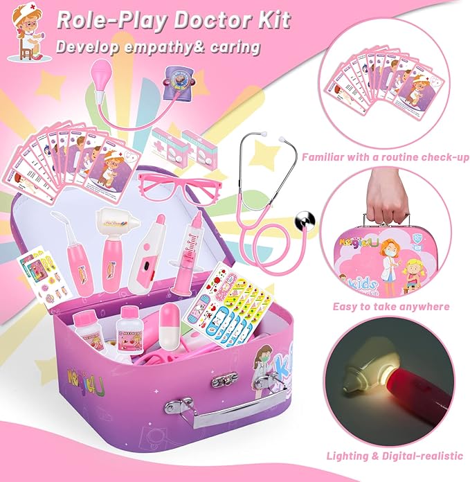 - Complete Doctor Kit for Kids 3-7 Years Old - Our Magic4U Kids Doctor Set features a bunch of play doctor tools including a child size Doctor Surgical Gown, a Hat and a Mask, a Working Stethoscope, a Blood Pressure Cuff, a Thermometer, a Toy Syringe, a Dental Mirror, an Otoscope, a pair of Glasses, a Sheet of Visiting Doctor Cards, some Play Bandages, some Pill Boxes and Bottles, and a Carrying Case to store all the essentials. Total: 34 Pieces.