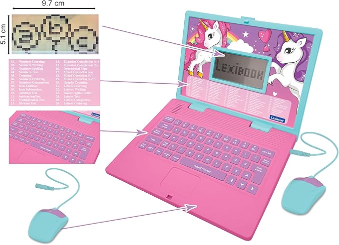 LEXiBOOK - Unicorn Educational and Bilingual Laptop Spanish/English - Toy for Children with 124 Activities to Learn Mathematics, Dactylography, Logic, Clock Reading, Play Games and Music - JC598UNIi2