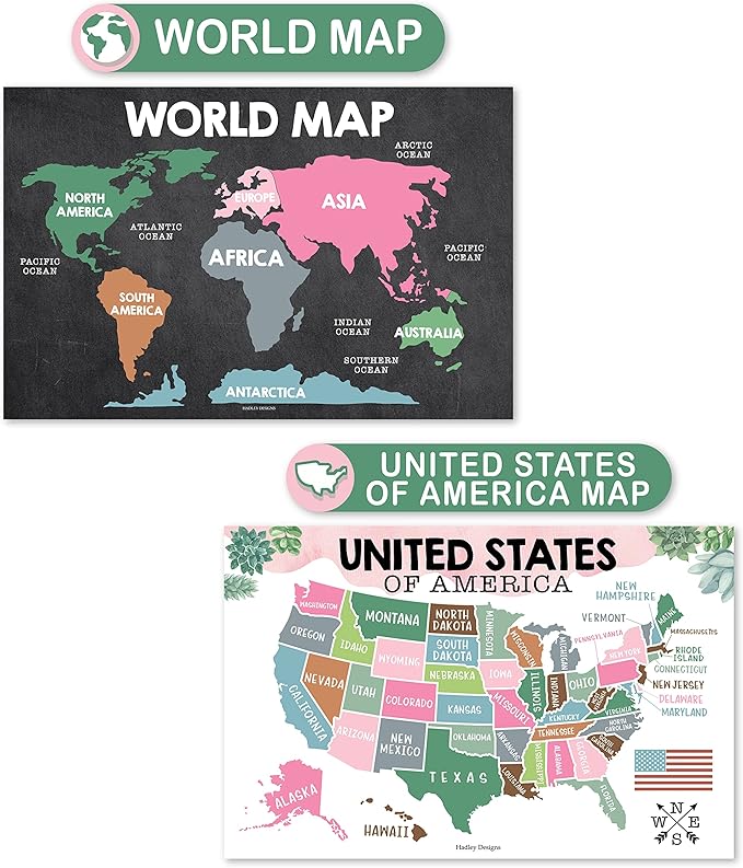 Hadley Designs 4 Alphabet, Map of United States, World Map, & Solar System Posters - Laminated ABC Charts for Toddlers Wall Decor, Cactus Posters for Kindergarten, Prek Classroom or Homeschool 11x17