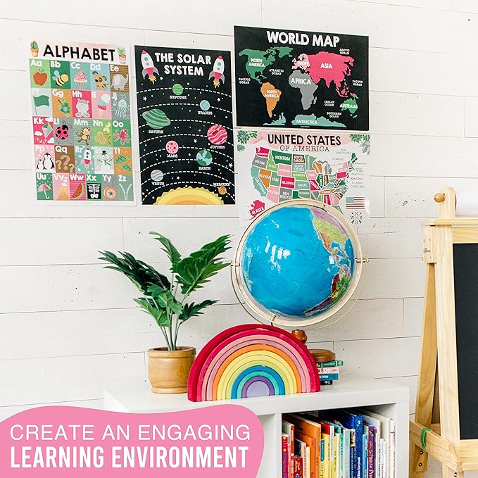 - Make Learning Fun; You'll receive 4 different 11x17" laminated posters, 1 - Alphabet Chart For Toddlers, 1 - Kids USA Map Poster, 1 - Classroom World Map Chart, and 1 - Solar System Map Poster; Use these as preschool learning posters/preschool educational posters for kindergarten