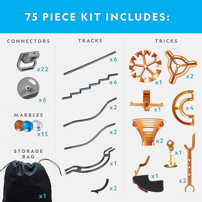 - DESIGN, BUILD, TEST, CREATE - This wildly creative super puzzle includes 42 tracks & connectors, 17 trick pieces & 15 marbles for infinite building combinations and endless amounts of creative fun!