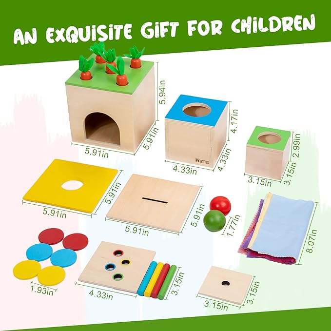 Adena Montessori 6 in 1 Play Kit Toy- 3 Nesting & Stacking Boxes, Object Permanence Drop Game, Coin Box, Carrot Harvest,Tissue Box,Sticks Matching Game for 6-12 Months 1 Year Old Toddlers 2 Year