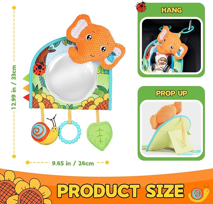 - BABY MIRROR FOR CAR TOY : The baby mirror for car toy comes with lovely Elephant, hanging soft toys that crinkle, teether, and colorful clip, one big baby-safe Mirror, your kiddo will love it