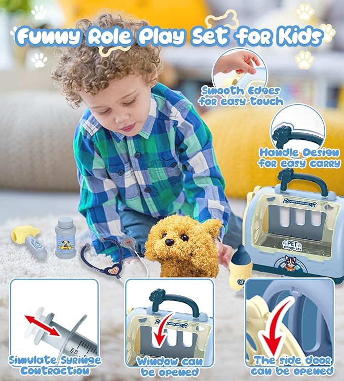 - Novelty Pretending Accessories: This pet care playset comes with different puppy grooming and treating toys, including a lovely plush puppy, pet carrier, stethoscope, shampoo, feeding bottle, comb, ear mirror, reflex hammer and syringe, etc.. It allow your children to experience the fun of pet owner with this rich and varied pet care accessories