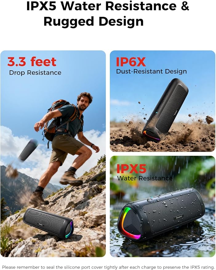 - [Tough & Weather-Resistant] Engineered to handle rough use and adverse weather conditions, this speaker features a durable design and an IPX5 rating for protection against water splashes and spills. It's an ideal choice for outdoor events, and is perfect for use at parties, at the pool, on the beach, while camping or hiking, and more