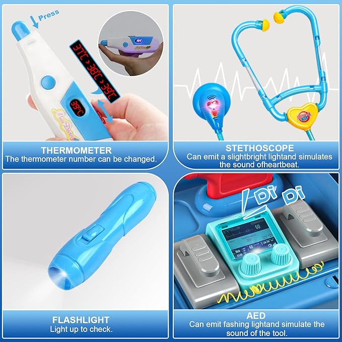 - 【REALISTIC PRETEND PLAY DOCTOR KIT FOR TODDLERS】This complete 25-piece doctor toddler playset includes a kids' doctor cart and doctor costumes, featuring stethoscopes, defibrillators, flashlights, and thermometers with realistic sound and light effects. Children can recreate various medical scenarios like doctor rounds, operating rooms, emergency care, and dental checkups. By incorporating existing toy pets, kids can also fulfill their dreams of becoming veterinarians. These immersive role-playing experiences fully nurture children’s curiosity and imagination about medical professions.