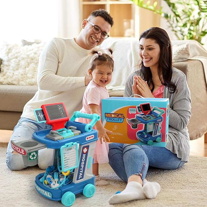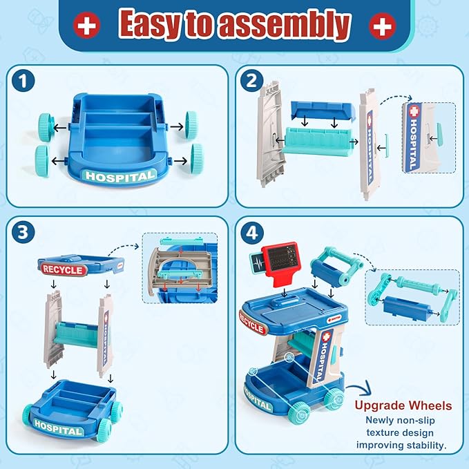 - 【SAFE & DURABLE TOYS FOR GIRLS BOYS 3-5】Made from high-quality, durable plastic designed for children's toys, this toddler doctor play set is no BPA and odor-free and is built to last through years of play. Every piece in this doctor set features smooth, rounded edges with no sharp parts, giving parents peace of mind. The doctor cart is equipped with upgraded non-slip wheels for steady movement and stability, preventing tipping during play.