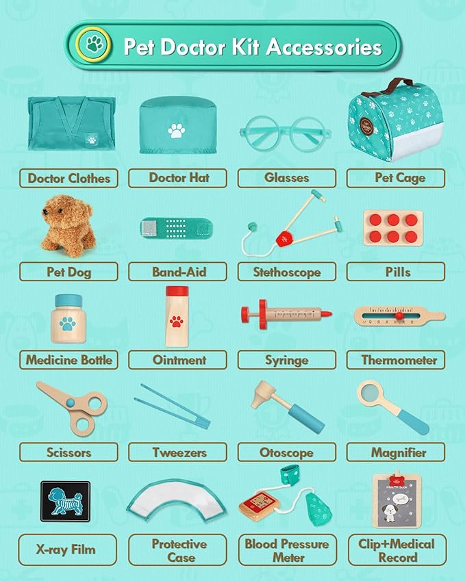 - Safe & High-Quality: Made from smooth, non-toxic wood, this doctor kit is safe for children with no sharp edges. It also includes a dog crate, so kids can take their furry friend on the go