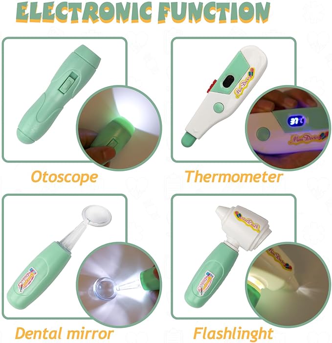 - BE A REAL DOCTOR: Our medical tools with sound and light effects bring auditory and visual stimulation to boys and girls. Especially when kids put on adorable doctor costume, they can have a more immersive experience with doctors