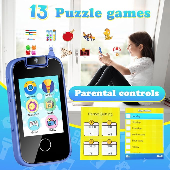 - 【Upgraded touch screen kids phone】Upgraded to touch screen dual camera configuration, combined with kids camera and music player, designed a 2.8 inch touch screen phone for toddlers. This kids phone has rich features including rotating camera, video, music, games, habit tracker, calculator, audiobook, alarm clock, ABC alphabet, flashlight and more. Your child deserves this children's toy that can play and learn at the same time.