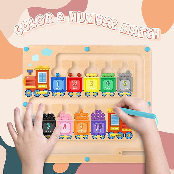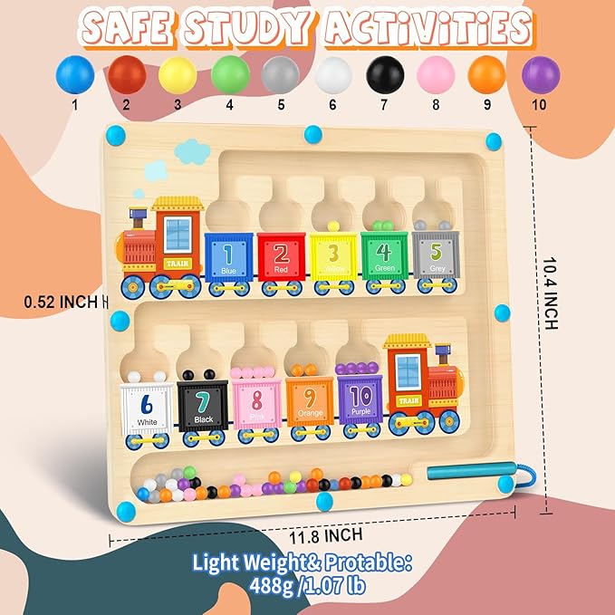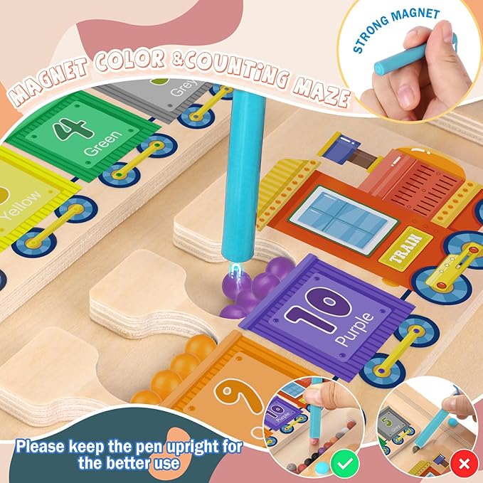 - 【Interesting Number and Color Maze】This is an interesting educational toys designed to help children recognize colors and learn numbers. Children can use the magnetic stick to attract the corresponding color and number of magnet balls into the corresponding paint train. This keeps them quiet and focused, enjoys color sorting and counting, and inspires interest in learning math.
