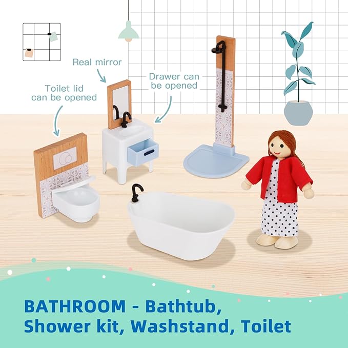 - WOODEN DOLLHOUSE - Modern doll house includes kitchen, bathroom, living room, balcony and bedroom. Each room is equipped with a set of furniture. There are 4 family dolls, about 3-4 inches high. Lovely furniture toys adds more fun to toddler girls and boys. Come and decorate your toy house!
