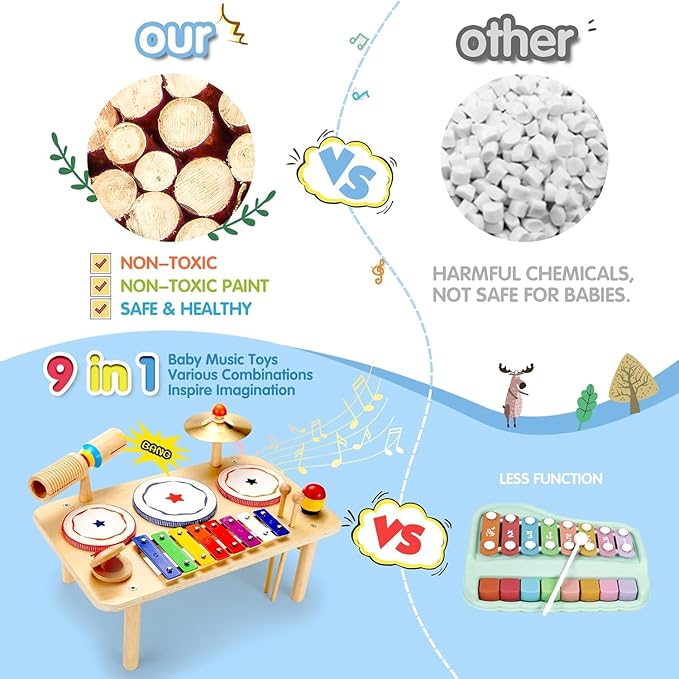- 9-IN-1 MUSIC ADVENTURE: This baby drum set (16" L × 10" W × 10" H, 3 lbs) turns sound exploration into joy. With 3 drums, a rainbow xylophone from C to C, cymbal, maracas, and a wooden tone block, toddlers 1–3 can discover rhythm, melody, and movement. Bright patterns and smooth wooden texture make every session a playful art of color and sound.