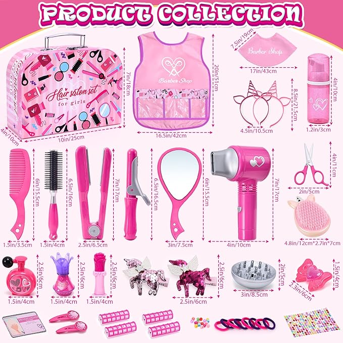 - 【Super Luxurious 49 Pcs Hair Salon Kits for Girls】---Our girls hair salon toys set includes 49 pcs kids barber set toys, 1*realistic hair dryer with 2*different style hair dryer head, 1*stylist apron, 1*stylist shawl, 1* unicorn comb, 1*curling iron, 1* flat iron, 1*round hair brush, 1*comb, 5*hair rollers,1*scissor, 1*vip card ,3*toy perfume, 1*toy lipstick, 3*hair spray, 2*unicorn hairpin, 11 hair ties, 11*decorative accessories and an exquisite carrying gift